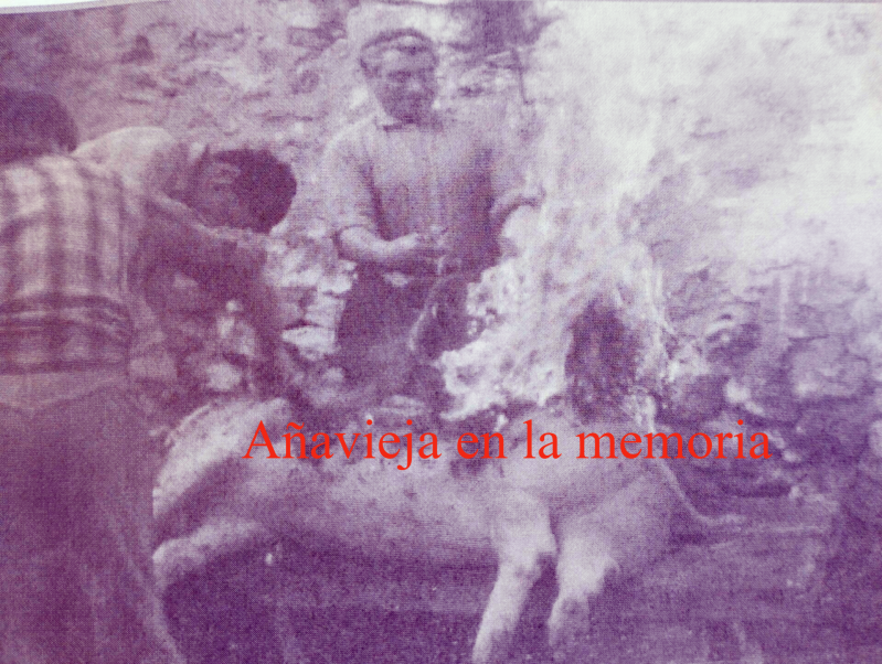 13. En el mismo instante de la matanza: el hábil matarife, Abilio; el ayudante con gancho, José Luis; Teodoro sujeta el animal y Corpus observa