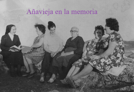 Seis mujeres toman el fresco en el Castillo. Puede verse San Blas y los campos. Las mujeres charlan y rien. Es una reunión alegre. Seguramente contarán historias de niñas. Las protagonistas de la imagen son (de izda. a dcha.: Consuelo (monja), Benedicta, Corpus, tía María, tía Narcisa y Felicia Crespo (nacida en Añavieja, pero residente en Mallén).
