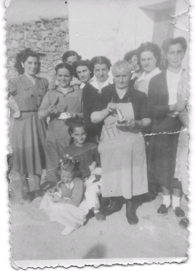 Bautizo de Ana M. Pascual, madre de Eva y Sara, esposa de Ramón Ferrer. También abuela de Lorien. De izquierda a derecha vemos al padrino, Serafín Sainz Moreno, a Javier, hermano de la bautizada, a Feli, la madrina y prima. La madre, Guadalupe, aparece en un segundo plano, de luto, porque no hacía mucho tiempo algún familiar habría fallecido. En la puerta de la casa familiar están la tía Enriqueta, tía abuela, y Loli, prima. Enriqueta sujeta a Pablo, hermano, que quería formar parte de la instantánea, mientras el padre, Valentín, mira la escena protegiendo la vista del sol. Era verano. Lo atestigua la vestimenta.